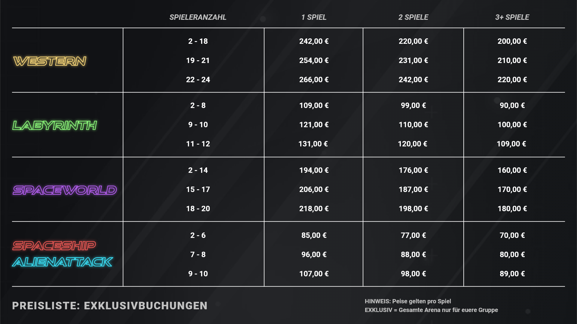 | Paketpreis für bis zu 8 Spieler | 199,20 € |